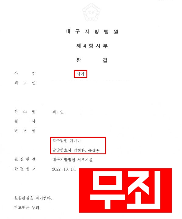 결과적으로 의뢰인은 억울한 사기죄 실형 위기에서 무죄 판결을 받았습니다.