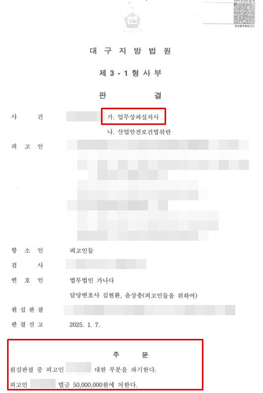 1심에서 산업안전보건법 위반, 업무상과실치사로 징역 및 집행유예 선고 받았으나