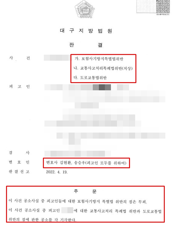 (1심) 보험사기방지특별법위반 무죄 / 교통사고처리특례법위반(치상) 공소기각 / 도로교통법위반 공소기각
