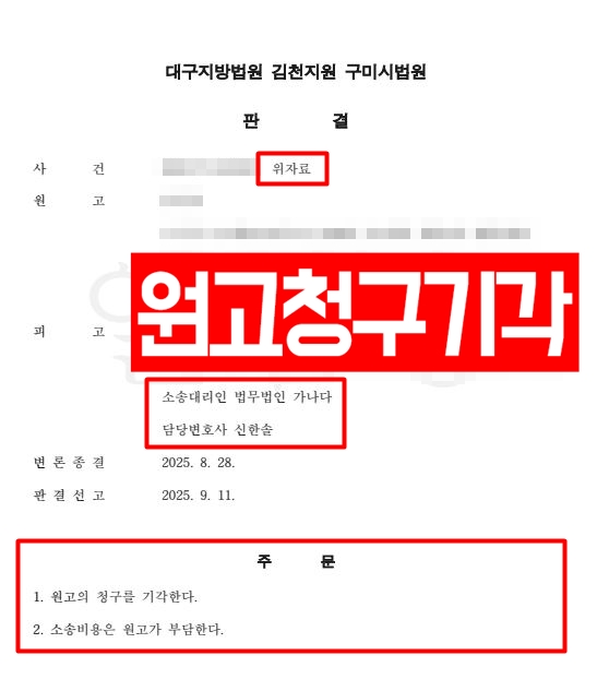 저희 가나다가 적극적으로 조력한 결과 원고의 위자료 청구를 기각시키고 변호사비용까지 받아냄으로써 의뢰인은 억울함을 해소할 수 있었습니다.
